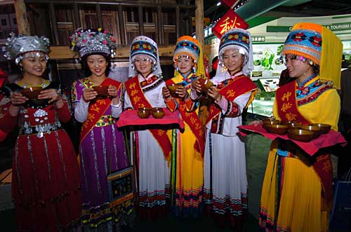 日前,重慶召開了生態(tài)旅游年大型推介會(huì),這是重慶黔江土家族代表請(qǐng)觀展者品酒。 2007年是重慶市確立的生態(tài)旅游年,本次推介會(huì)突出生態(tài)旅游主題,著重表現(xiàn)重慶的生態(tài)旅游資源特色,多姿多彩的民族風(fēng)情表演也是展會(huì)的重要內(nèi)容。重慶開展“生態(tài)旅游年”活動(dòng)旨在充分利用該市豐富的生態(tài)旅游資源,推進(jìn)一大批生態(tài)旅游項(xiàng)目和品牌建設(shè)。 |
