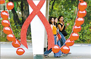 三名菲律賓婦女從象征艾滋病的紅絲帶旁經(jīng)過。近年來菲律賓感染艾滋病病毒的人數(shù)不斷上升。