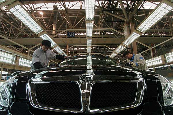 4月4日,華晨汽車集團(tuán)中華轎車總裝車間的兩位工人在生產(chǎn)線上作業(yè)。為滿足市場(chǎng)需求,華晨汽車集團(tuán)全面提高產(chǎn)能,目前,中華轎車日產(chǎn)445輛,平均2分18秒生產(chǎn)一輛。據(jù)了解,2007年1月中華轎車銷量突破10000輛。