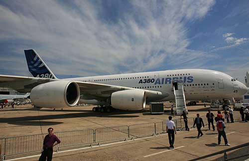19日,一架空中客車A380在法國巴黎的國際航空航天展上展出?湛虯380是目前世界上載客量最大的客機,目前的訂單已達173架。
