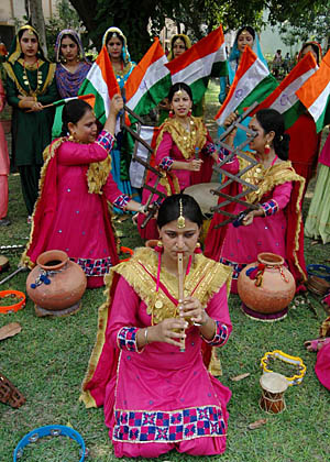 11日,在印度旁遮普邦的阿姆利則市,年輕的印度姑娘們載歌載舞參加獨(dú)立日慶典彩排。印度將于8月15日迎來(lái)第60個(gè)獨(dú)立日。
