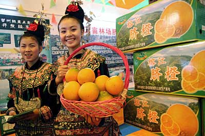 11月7日,工作人員在展示貴州榕江縣出產(chǎn)的臍橙。