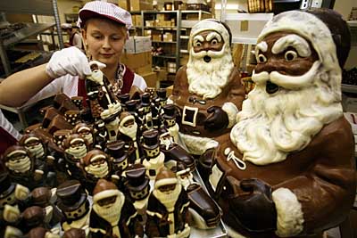 6日,德國東部一家小型巧克力工廠的雇員在分揀巧克力“圣誕老人”。隨著圣誕節(jié)的臨近,這家工廠開足了馬力,每天使用400公斤到500公斤的巧克力制作各式各樣的巧克力糖果。
