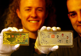 北京2008年奧運會五福賀歲金、銀條將于1月8日在北京上市銷售。“五福賀歲金、銀條”由北京奧組委授權(quán)、中國印鈔造幣總公司制造發(fā)行、中鈔國鼎投資有限公司總經(jīng)銷!拔甯YR歲金條”規(guī)格分別為50克、100克、500克和1000克四種;“五福賀歲銀條”規(guī)格分別為50克、100克和1000克三種。