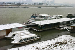 冰雪覆蓋下的長(zhǎng)沙旅游客運(yùn)碼頭(1月15日攝)。 1月15日,受南下冷空氣影響,長(zhǎng)沙普降大雪,多年不遇的冰凍天氣驟臨,市區(qū)內(nèi)交通嚴(yán)重受阻。截至記者發(fā)稿,長(zhǎng)沙城內(nèi)所有公路立交橋及跨江大橋均出現(xiàn)冰凍,影響行人、車輛通行。目前,長(zhǎng)沙市有關(guān)部門已啟動(dòng)應(yīng)急搶險(xiǎn)預(yù)案,做好防寒防凍工作,并加強(qiáng)警力疏導(dǎo),制訂保證主干道暢通的交通管制預(yù)案。據(jù)氣象部門預(yù)測(cè),這種天氣大約將持續(xù)一周時(shí)間。 |