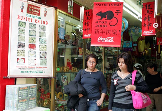 29日,在墨西哥首都墨西哥城的唐人街,兩名女孩從一家售賣中國年貨的店鋪內(nèi)走出。中國春節(jié)臨近,位于墨西哥城的唐人街一派喜慶氣氛。這里的年貨市場開始紅火起來,售賣的大都是中國商品,象征吉祥的“中國結(jié)”、中國“喜鼠”等受到許多當(dāng)?shù)厝说南矏邸?/TD>