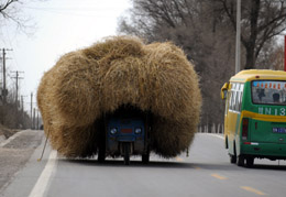 在甘肅省境內(nèi)省道309線康家崖至臨夏公路上,經(jīng)常行駛著裝滿麥草的農(nóng)用機動車。這些滿滿當(dāng)當(dāng)?shù)霓r(nóng)用車行駛在公路上,活像一個個移動的巨大草垛,其交通安全實在令人擔(dān)憂。