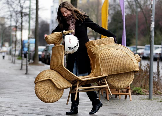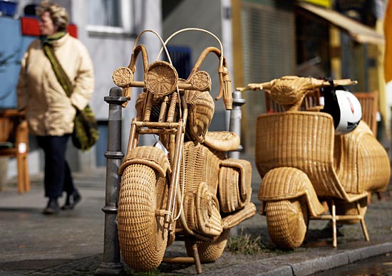 藤制摩托車近日亮相德國。這種純手工編織而成的“交通工具”不需使用燃料,售價約為三百五十歐元。新華社\法新