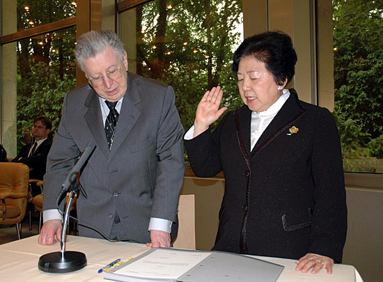 20日,中國律師張月姣(右)在日內(nèi)瓦世界貿(mào)易組織總部宣誓,正式就任世貿(mào)組織上訴機構(gòu)法官。上訴機構(gòu)是世貿(mào)組織負責貿(mào)易爭端裁決的最高機構(gòu),由7名法官組成。這是中國內(nèi)地律師首次在世貿(mào)組織中擔任這一重要職務(wù)。
