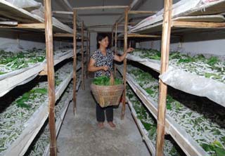 |   江西萬(wàn)年大力發(fā)展蠶桑產(chǎn)業(yè)。目前全縣桑園面積已發(fā)展到9000畝,養(yǎng)蠶農(nóng)戶達(dá)7000多戶,并全部實(shí)現(xiàn)手持訂單生產(chǎn)。8月30日,上坊鄉(xiāng)港邊村技術(shù)工人郝國(guó)珍在喂養(yǎng)桑蠶。新華社發(fā)(周科