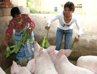 |   云南開(kāi)遠(yuǎn)養(yǎng)豬戶母豬領(lǐng)“補(bǔ)貼”。圖為樹(shù)木克上寨村彝族養(yǎng)豬戶周華清(右1)在給喂食快出欄的架子豬在政府補(bǔ)助下,她家養(yǎng)豬年獲益4萬(wàn)多元。新華社記者