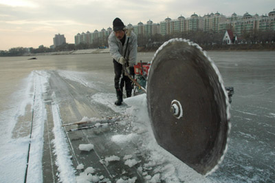 12月7日,采冰工人在牡丹江江濱公園附近的冰面上采冰。