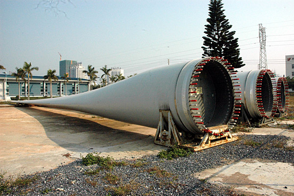 目前國內(nèi)最大的2.5兆瓦風力發(fā)電項目正在廣西北海市緊張施工,預計3月份即可投產(chǎn)。它是當?shù)匾患绎L力發(fā)電設備生產(chǎn)企業(yè)的示范項目,高達80米的機艙由德國設計師盧吉·科拉尼(Luigi Colani)設計,巨大的風車建成后將成為當?shù)匾粋標志性景觀。機組年發(fā)電達400萬千瓦小時,可滿足1600戶居民用電。圖為已制成的長達45米的風車葉片。