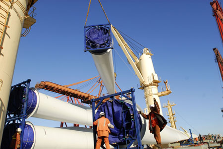 1月14日,一批由中國(guó)中材集團(tuán)公司自主研發(fā)制造的風(fēng)電設(shè)備從天津港裝船運(yùn)往印度。據(jù)了解,這批風(fēng)電設(shè)備共30套,葉片長(zhǎng)度達(dá)到40.2米,單機(jī)容量達(dá)到1.5兆瓦。
