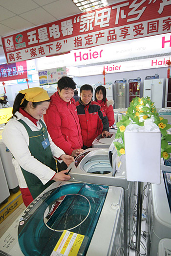 2月1日,江蘇省“家電下鄉(xiāng)”工作正式啟動(dòng)。江蘇省贛榆縣農(nóng)村居民在指定銷(xiāo)售點(diǎn)選購(gòu)家電。