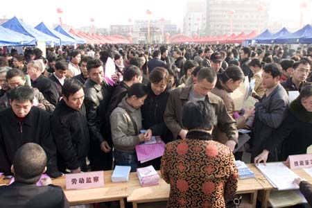 2月10日,返鄉(xiāng)農(nóng)民工在湖北襄樊樊城人民廣場舉行的送崗位、送培訓(xùn)、送信息、送信心“四送”活動現(xiàn)場進(jìn)行就業(yè)咨詢。