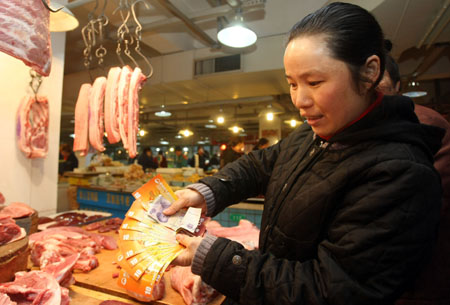 2月18日,在杭州市仙林苑農(nóng)貿(mào)市場,一位市民準(zhǔn)備用剛領(lǐng)到的農(nóng)貿(mào)市場消費(fèi)券購買豬肉。當(dāng)日,杭州市下城區(qū)部分困難家庭領(lǐng)到了社區(qū)附近農(nóng)貿(mào)市場發(fā)放的專用消費(fèi)券,持券家庭可在指定農(nóng)貿(mào)市場內(nèi)購買糧、油、菜等。1月底,杭州市部分農(nóng)貿(mào)市場率先發(fā)放農(nóng)貿(mào)市場專用消費(fèi)券,惠及杭州市、區(qū)兩級低保、困難家庭。從2月18日開始的第二批消費(fèi)券發(fā)放活動,參與這項(xiàng)活動的農(nóng)貿(mào)市場和受惠家庭范圍都有所擴(kuò)大。 |