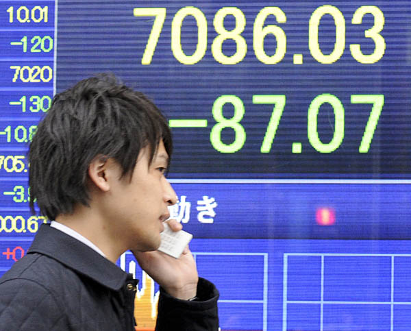 3月9日,在日本首都東京,一名路人經(jīng)過電子股價顯示牌。當(dāng)日,東京股市日經(jīng)225種股票平均價格指數(shù)下跌1.21%,跌至26年多來的最低水平。新華社/法新
