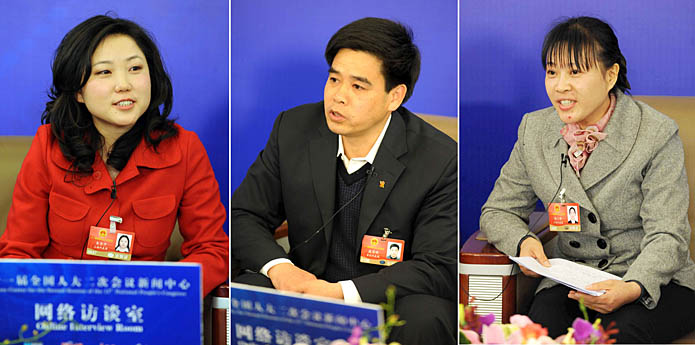 他們是農(nóng)民工的代言人,他們傳遞著農(nóng)民工的心聲。兩會上,他們?yōu)檗r(nóng)民工這個群體呼吁奔走,讓更多的人來關(guān)注、關(guān)心、關(guān)愛這個群體。 為了匯聚工友們的心聲,從2008年當選全國人大代表以來,康厚明、朱雪芹、胡小燕3位農(nóng)民工代表的生活變得不同尋常,聆聽、反映農(nóng)民工心聲成為他們的最大心愿。 (左圖)3月10日,全國人大代表、上海華日服裝有限公司團支部書記、工會副主席朱雪芹與網(wǎng)民在線交流。她說,當了代表以后,有很多農(nóng)民工打電話給我,也備受媒體的關(guān)注,我們感受到了社會各界對農(nóng)民工群體的關(guān)注。我們不孤單。 (中圖)3月10日,全國人大代表、重慶城建集團市政一公司路面處農(nóng)工班班長康厚明與網(wǎng)民在線交流。他說,很多工友向我反映社會養(yǎng)老保險問題,這是我們農(nóng)民工最關(guān)注的。我一定會一心一意為農(nóng)民工反映這個問題。目前這個問題已經(jīng)得到了國家的重視。 (右圖)3月10日,全國人大代表、廣東省佛山市三水新明珠建陶工業(yè)有限公司成品車間副主任胡小燕與網(wǎng)民在線交流。她說,希望政府能加大對農(nóng)民工培訓和回鄉(xiāng)創(chuàng)業(yè)的扶持力度,進一步完善社保制度,解決社會保險關(guān)系異地轉(zhuǎn)移等問題。 |