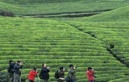 3月28日,攝影愛好者在湄潭縣拍攝“茶!憋L(fēng)光。貴州省湄潭縣是黔北地區(qū)最大的茶葉生產(chǎn)基地,有茶園約20萬畝,被譽為“西部茶鄉(xiāng)”,當(dāng)?shù)氐牟鑸@連片發(fā)展,形成了蔚為壯觀的“茶!,成為鄉(xiāng)村生態(tài)旅游的“名片”。