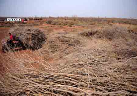 4月13日,在杭錦旗烏蘭鄉(xiāng),一位牧民正在源豐公司的收購點(diǎn)交售沙柳。 內(nèi)蒙古源豐投資有限公司2009年在內(nèi)蒙古杭錦旗庫布其沙漠和毛烏素沙漠種植沙柳11萬畝,利用沙柳資源發(fā)電,在開發(fā)“綠色電力”的同時(shí)帶動(dòng)當(dāng)?shù)鼗哪卫怼?/P>