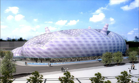 占地6000平方米的日本館,是上海世博會40個左右外國自建館中規(guī)模最大的一類。淡紫色的建筑外觀,由太陽的紅色與水的藍(lán)色融合而來;弧形穹頂?shù)男Q繭造型,取“蠶有長壽”的寓意,而從蠶繭中抽取蠶絲、織成絲絹的工藝,正是從中國傳入日本的,是中日之間“緊密連接”的象征。這是上海世博會日本館效果圖。