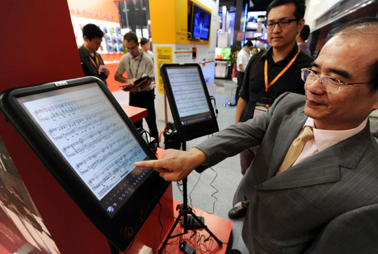 13日,全球最大規(guī)模的電子產品貿易展覽——第29屆香港秋季電子產品展在香港會議展覽中心開幕,展覽為期四天。本屆展覽共展出2852家參展商的最新電子產品。圖為參觀者正在一展覽會展臺前親手體驗電子樂譜。