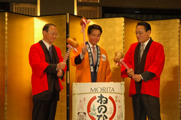 17日,在日本名古屋,中國國家旅游局局長邵琪偉(左)、日本國土交通大臣前原誠司(中)和韓國文化體育觀光部長官柳仁村(右)以敲開酒桶的方式啟動第四屆中日韓旅游部長會議。第四屆中國、日本、韓國旅游部長會議17日晚在日本名古屋開幕。中日韓三國旅游部門領導人表示,將進一步加強三國旅游合作,攜手共進,應對危機。