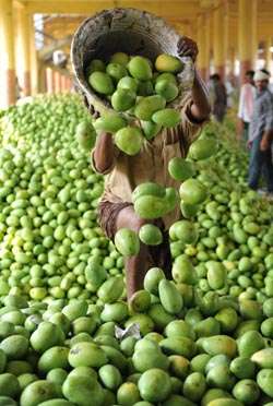 一名工人在印度海德拉巴附近的一個(gè)水果市場倒芒果。印度盛產(chǎn)芒果,這里每年出產(chǎn)的芒果接近世界總產(chǎn)量的一半。新華社/法新 |