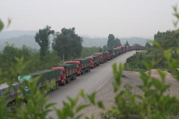 隨著夏季之前電煤運(yùn)輸高峰期的到來(lái),連通陜西省神木縣和山西省的煤炭資源外運(yùn)大通道神(木)盤(塘)公路上的運(yùn)煤車輛排起長(zhǎng)龍。本報(bào)記者 梁愛(ài)平