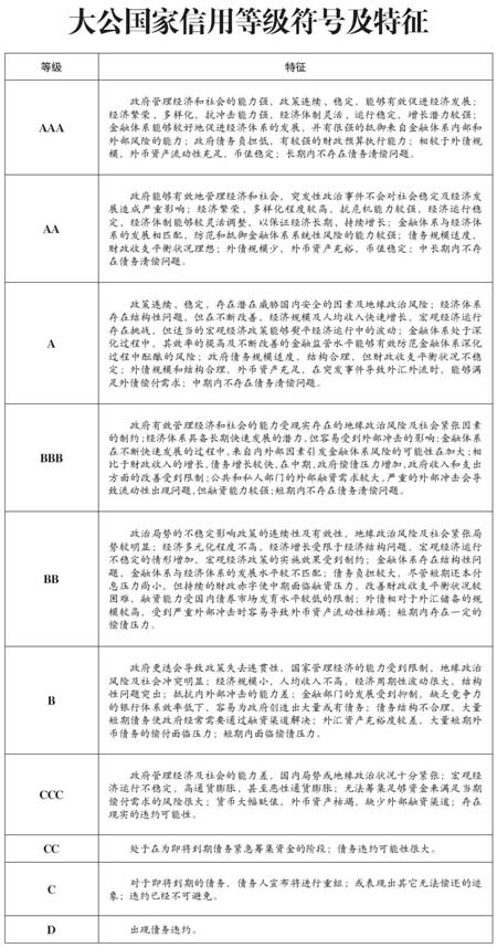 根據(jù)確定的影響國家信用風(fēng)險五大關(guān)鍵評級要素及能夠刻畫這些要素的具體指標(biāo),大公建立了國家信用評級操作系統(tǒng)。錄入指標(biāo)數(shù)據(jù),依據(jù)設(shè)定的評分方法和評分標(biāo)準(zhǔn),系統(tǒng)會產(chǎn)生初始信用等級,之后經(jīng)過信用評審委員會的調(diào)整形成最終的本、外幣國家信用等級。其具體思路和步驟如下: 第一步,分別確定國家管理能力、經(jīng)濟(jì)實(shí)力、金融實(shí)力、財(cái)政實(shí)力及外匯實(shí)力的信用分值。 以國家管理能力為例,首先對其中的各項(xiàng)指標(biāo)進(jìn)行模型量化處理,接下來將得分加權(quán)平均,得到一國國家管理能力的最初得分,之后評審會會綜合考慮在模型中沒有體現(xiàn)的該國在國家管理能力方面的特有優(yōu)勢或劣勢,并通過國家間的比較,對初始得分進(jìn)行一定調(diào)整,最后得到該國家的最終得分。分值區(qū)間從0到9,0分代表風(fēng)險最高,9分代表風(fēng)險最低。 第二步,對前四大要素進(jìn)行加權(quán)平均,得到本幣信用分值,并將分值對應(yīng)為信用等級。 大公國家信用等級從高到底,從AAA到D共十個等級。除“AAA”、“C”和“D”等級外,每個信用等級可用“+”或“-”進(jìn)行微調(diào),分別表示比相應(yīng)等級的信用質(zhì)量稍高或稍低。 第三步,綜合外匯實(shí)力得分,對本幣信用等級進(jìn)行調(diào)整,得到外幣信用等級。 外匯實(shí)力很強(qiáng)的國家,外幣信用等級有可能超過本幣信用等級,但在多數(shù)情況下,外幣信用等級會等于或低于本幣信用等級。 這樣,最終得到了本幣和外幣的國家信用等級。下面列出大公國家信用等級符號及相應(yīng)等級的信用風(fēng)險特征。應(yīng)強(qiáng)調(diào)的是,被評定為某一信用等級的國家,并非必須滿足該信用等級相對應(yīng)的所有特征,但一般應(yīng)滿足其中多項(xiàng)特征。