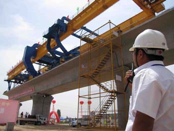 6月18日,陜西興平西寶客運(yùn)專線架梁施工現(xiàn)場,西?瓦\(yùn)專線全線開始架梁。新華社記者李一博/攝 |