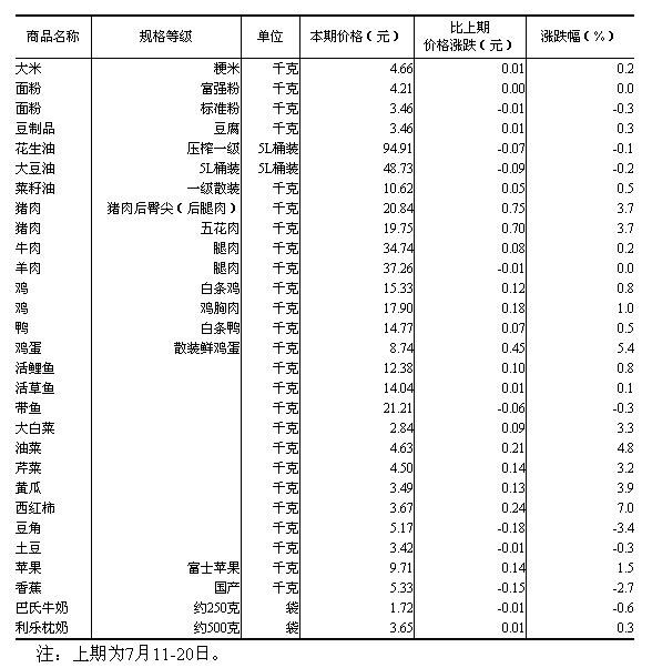 50個城市主要食品平均價格變動情況(7月21-30日)