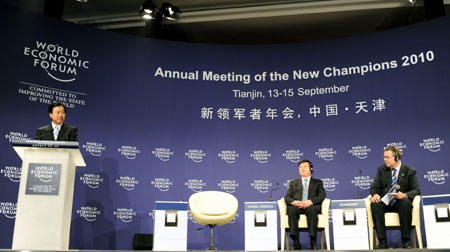 9月15日,在天津梅江會(huì)展中心,大連市委書記夏德仁(左一)在閉幕全會(huì)上講話。當(dāng)日,世界經(jīng)濟(jì)論壇2010年新領(lǐng)軍者年會(huì)(第四屆達(dá)沃斯論壇)舉行閉幕全會(huì)。