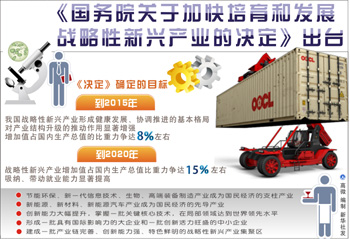 10月18日,《國(guó)務(wù)院關(guān)于加快培育和發(fā)展戰(zhàn)略性新興產(chǎn)業(yè)的決定》指出,根據(jù)戰(zhàn)略性新興產(chǎn)業(yè)的特征,立足我國(guó)國(guó)情和科技、產(chǎn)業(yè)基礎(chǔ),現(xiàn)階段將重點(diǎn)培育和發(fā)展節(jié)能環(huán)保、新一代信息技術(shù)、生物、高端裝備制造、新能源、新材料、新能源汽車(chē)等產(chǎn)業(yè)。到2015年,七大戰(zhàn)略性新興產(chǎn)業(yè)的增加值占中國(guó)GDP的比重將提高到8%,到2020年將升至15%。