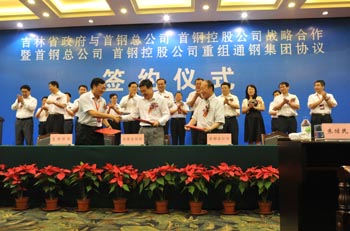 吉林省副省長王祖繼代表省政府與首鋼總公司董事長朱繼民、首鋼控股公司總裁李志強共同簽訂了《戰(zhàn)略合作框架協(xié)議》。首鋼總公司、首鋼控股公司、吉林省國資委、吉林省建通投資公司、通鋼集團負(fù)責(zé)人共同簽署了《通鋼集團重組協(xié)議》。通化市政府與首鋼控股公司簽訂了《戰(zhàn)略合作框架協(xié)議》。