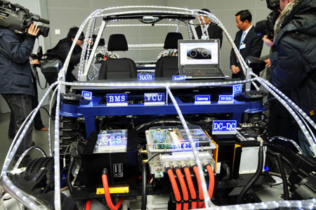 7日上午,一汽-大眾汽車有限公司與啟明信息技術(shù)股份有限公司簽訂“新能源汽車電子技術(shù)聯(lián)合開發(fā)”協(xié)議,雙方將成立“新能源汽車聯(lián)合試驗(yàn)室”,在技術(shù)合作、產(chǎn)品研發(fā)、產(chǎn)業(yè)促進(jìn)等多個(gè)層面進(jìn)行交流合作。這也標(biāo)志著一汽-大眾向新能源汽車進(jìn)軍的步伐提速。圖為一汽-大眾展出的電動(dòng)汽車研發(fā)平臺