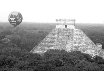 11月28日,在墨西哥坎昆的奇琴伊查瑪雅古城遺址旁,綠色和平組織升起一個巨大的熱氣球,呼吁人們保護環(huán)境。新華社發(fā)(普羅梅特奧·盧賽羅