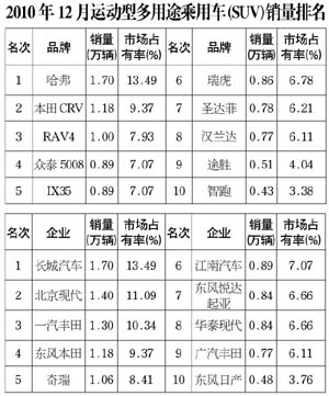 2010年12月運動型多用途乘用車(SUV)銷售12.62萬輛,環(huán)比下降4.93%,同比增長59.01%;12月銷量排名前10位的SUV品牌共銷售9.02萬輛,占SUV銷售總量的72%。
