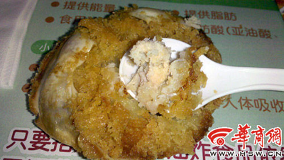 廣告很誘人,但消費卻讓人失望,說不出是什么味,但能肯定絕對不是蟹肉! 隨后記者購買了一只”黃金蟹斗”,聞起來也是一股刺鼻的味道,吃在嘴里感覺是魚肉蟹肉淀粉混合體,口感一般,但也并未發(fā)現(xiàn)有魚骨魚刺。