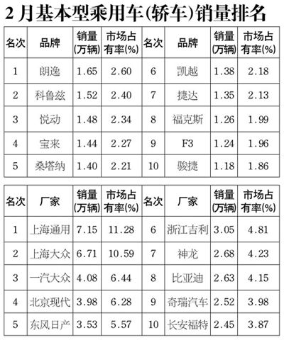 2月,銷量排名前十位的轎車生產(chǎn)企業(yè)下降較為明顯,其中奇瑞和一汽大眾降幅居前;與上年同期相比,上海通用、上海大眾、北京現(xiàn)代和神龍四家企業(yè)保持增長(zhǎng),其它六家企業(yè)呈現(xiàn)下降。2月,上述十家企業(yè)共銷售38.78萬(wàn)輛,占轎車銷售總量的61%。與上月比較,上海通用、上海大眾、一汽大眾繼續(xù)保持前三甲不變,東風(fēng)日產(chǎn)、長(zhǎng)安福特排名保持不變;北京現(xiàn)代、吉利、神龍排名分別上升兩位,比亞迪排名下降一位,奇瑞排名下降五位!