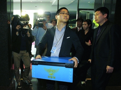圖為:3日,在韓國(guó)首都首爾的谷歌公司辦公室,一名警察搬運(yùn)在此沒(méi)收的物品。新華社/路透