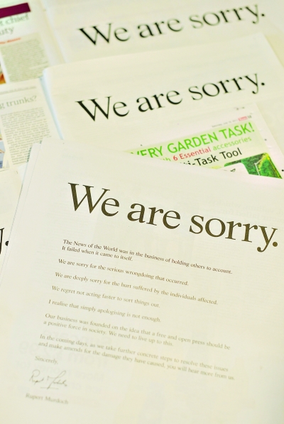 據(jù)路透社17日消息,默多克新聞集團下屬新聞國際前首席執(zhí)行官麗貝卡·布魯克斯因竊聽丑聞被英國警方逮捕,清查仍在繼續(xù)。而默多克最新公開的道歉信也未能平民怨,英國的執(zhí)政黨和在野黨都不滿意他的道歉,希望把新聞集團徹底趕出英國。 上圖為布魯克斯(右)和默多克。下圖為16日英國各大報紙當天刊登該道歉信。