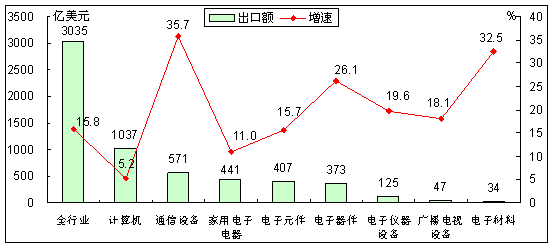 整機(jī)行業(yè)增速出現(xiàn)分化。上半年,整機(jī)行業(yè)出口相對(duì)低迷,特別是家電與計(jì)算機(jī)行業(yè),出口額分別為441和1037億美元,同比增長(zhǎng)11.0%和5.2%,增速低于全行業(yè)平均水平4.8和10.6個(gè)百分點(diǎn);通信設(shè)備行業(yè)出口增勢(shì)突出,出口額571億美元,同比增長(zhǎng)35.7%。6月份,通信設(shè)備行業(yè)出口增速比上月回升22.6個(gè)百分點(diǎn),是拉動(dòng)行業(yè)出口增速回升的主要?jiǎng)恿?家用電器和計(jì)算機(jī)行業(yè)出口增速分別比上月提高1.6和0.4個(gè)百分點(diǎn)。