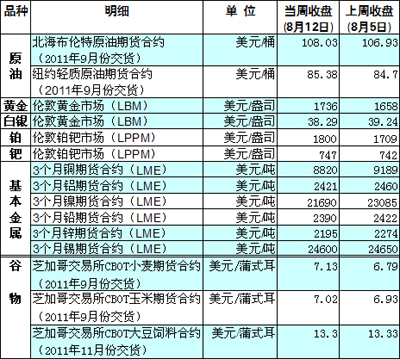 受標(biāo)準(zhǔn)普爾調(diào)低美國(guó)主權(quán)信用評(píng)級(jí)影響,當(dāng)周前兩個(gè)交易日多種大宗商品延續(xù)上周跌勢(shì)大幅下挫,隨著風(fēng)險(xiǎn)偏好的回升,多數(shù)品種觸底反彈,金價(jià)則走勢(shì)相反,在沖破每盎司1800美元后開(kāi)始回調(diào)。