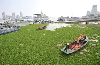 圖為8月29日武漢水上管理處清漂隊(duì)員在長(zhǎng)江武漢段打撈水葫蘆。當(dāng)時(shí),密密麻麻的水葫蘆綿延達(dá)數(shù)十公里。新華社發(fā)(葉火生/攝) |