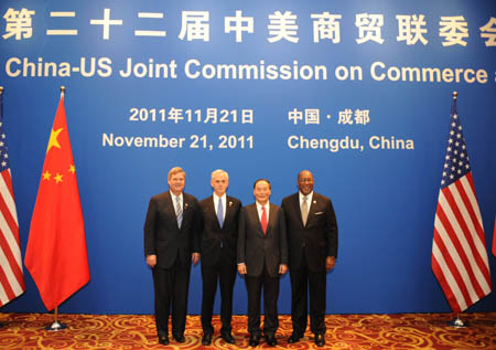 中國(guó)和美國(guó)21日在成都簽署了涉及知識(shí)產(chǎn)權(quán)、高技術(shù)、貿(mào)易統(tǒng)計(jì)、能源、企業(yè)合作對(duì)接等5個(gè)經(jīng)貿(mào)合作文件。第22屆中美商貿(mào)聯(lián)委會(huì)會(huì)議當(dāng)日于此間舉行,國(guó)務(wù)院副總理王岐山與美國(guó)商務(wù)部長(zhǎng)布賴森、貿(mào)易代表柯克共同主持會(huì)議,美國(guó)農(nóng)業(yè)部長(zhǎng)維爾薩克與會(huì)。會(huì)議后,雙方舉行了有關(guān)協(xié)議的簽字儀式。
