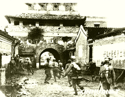 新華社記者黎楓拍攝的1947年9月我軍解放霸州縣的場景,畫面中的建筑為當(dāng)時霸縣的制高點鼓樓。