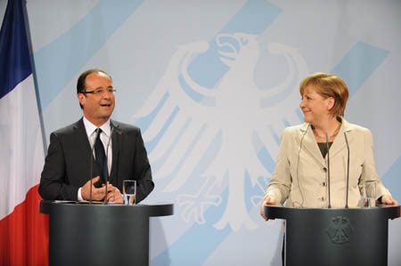 5月15日,德國總理默克爾(右)與來訪的法國新任總統(tǒng)奧朗德在柏林一同出席新聞發(fā)布會。 德國總理默克爾15日在柏林總理府與當(dāng)天剛剛就任法國總統(tǒng)的奧朗德舉行首次會晤。雙方承諾將合作克服分歧,尋找推動歐洲增長之路,同時(shí)表示希望希臘留在歐元區(qū),并將為此提供幫助。