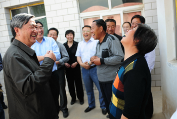 5月9日,在甘肅省定西市安定區(qū)太平村,新華社社長李從軍采訪養(yǎng)雞專業(yè)戶陳云花(前右)。說到高興處,陳云花開懷大笑。